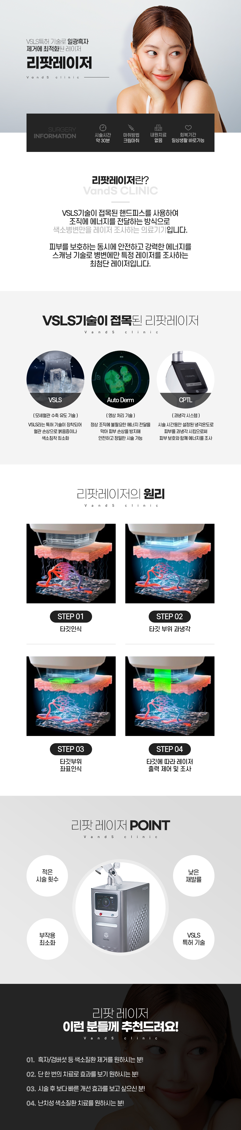 리팟 레이저는 흑자, 검버섯 등의 색소 병변을 치료하는 레이저 장비입니다. 쿨링 방식의 기술을 사용해 통증이 적고, 빠르게 시술할 수 있습니다.